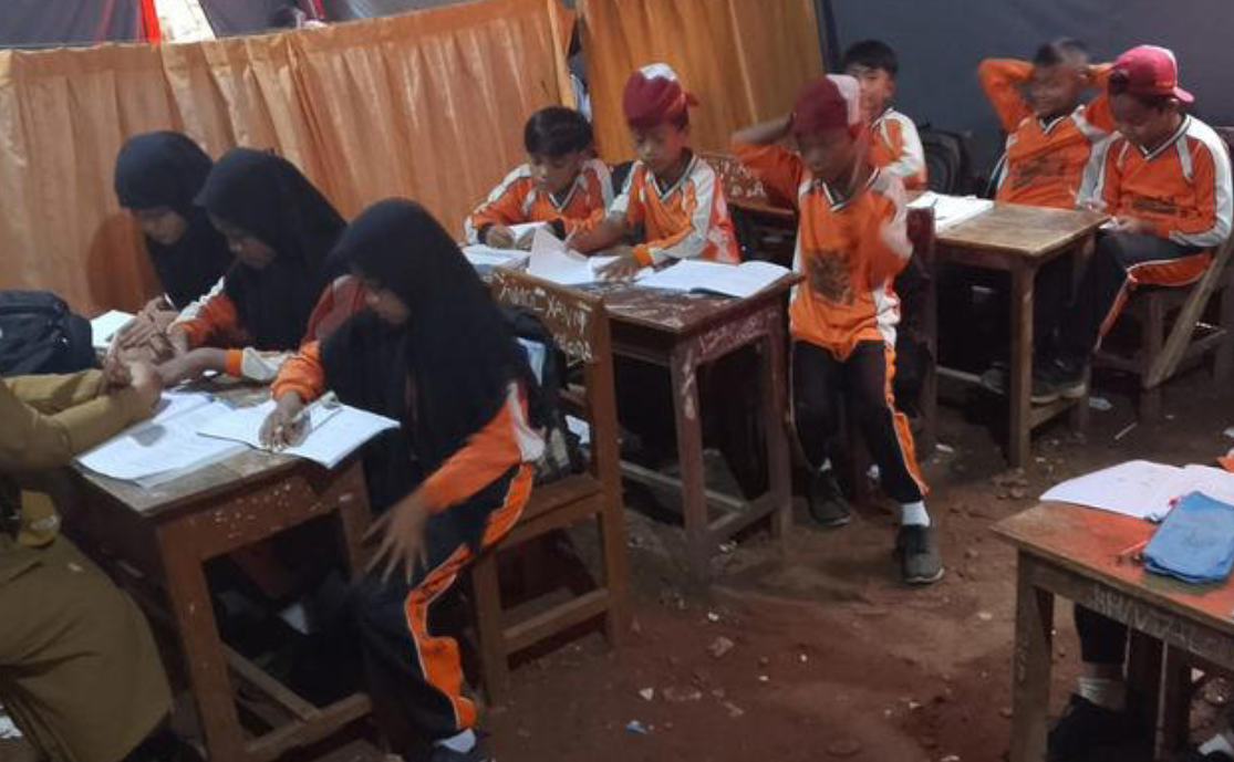 Kini, ruang kelas yang seharusnya menjadi tempat anak-anak belajar terkunci rapat. Meja, kursi, papan tulis, dan perlengkapan belajar tak bisa diakses. Para siswa hanya datang untuk mengambil menu Makan Bergizi Gratis (MBG) yang disediakan pemerintah. Sebagai solusi darurat, warga dan orang tua murid mendirikan tenda belajar dengan bantuan BPBD. Namun fasilitas sangat terbatas. Tidak ada listrik, tidak ada kipas angin, dan saat hujan turun, air merembes ke dalam tenda.